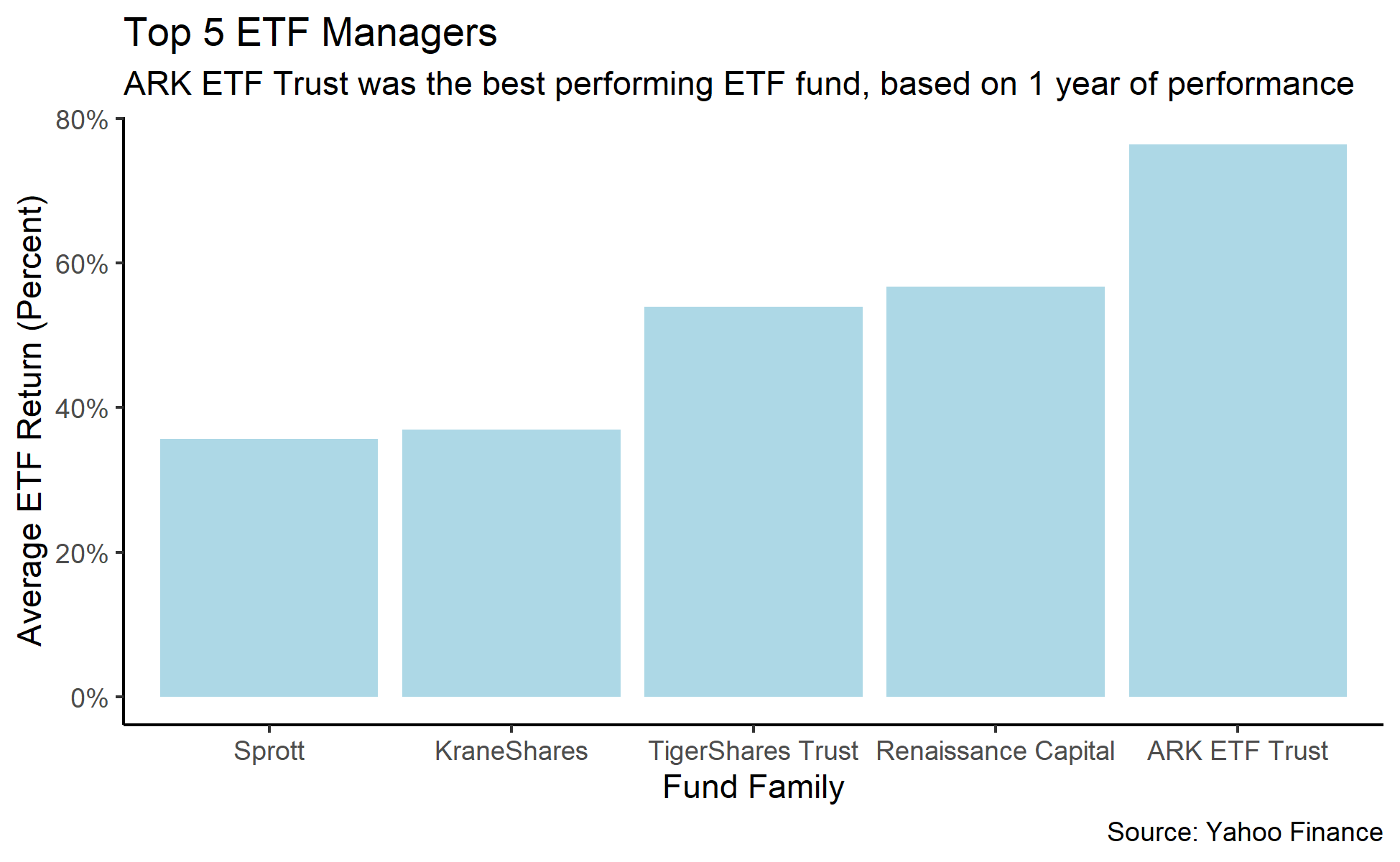 Overall, the ETFs that have best performed in the past year were growth focused investments in the technology sector. Due to the pandemic, there was immense growth in the technology sector during the past year as people moved to a digital environment. However, the technology sector still outperformed the rest of the sectors during the past 5 years. ARK was a popular fund that created many high-performing ETFs, beating the returns of other funds.