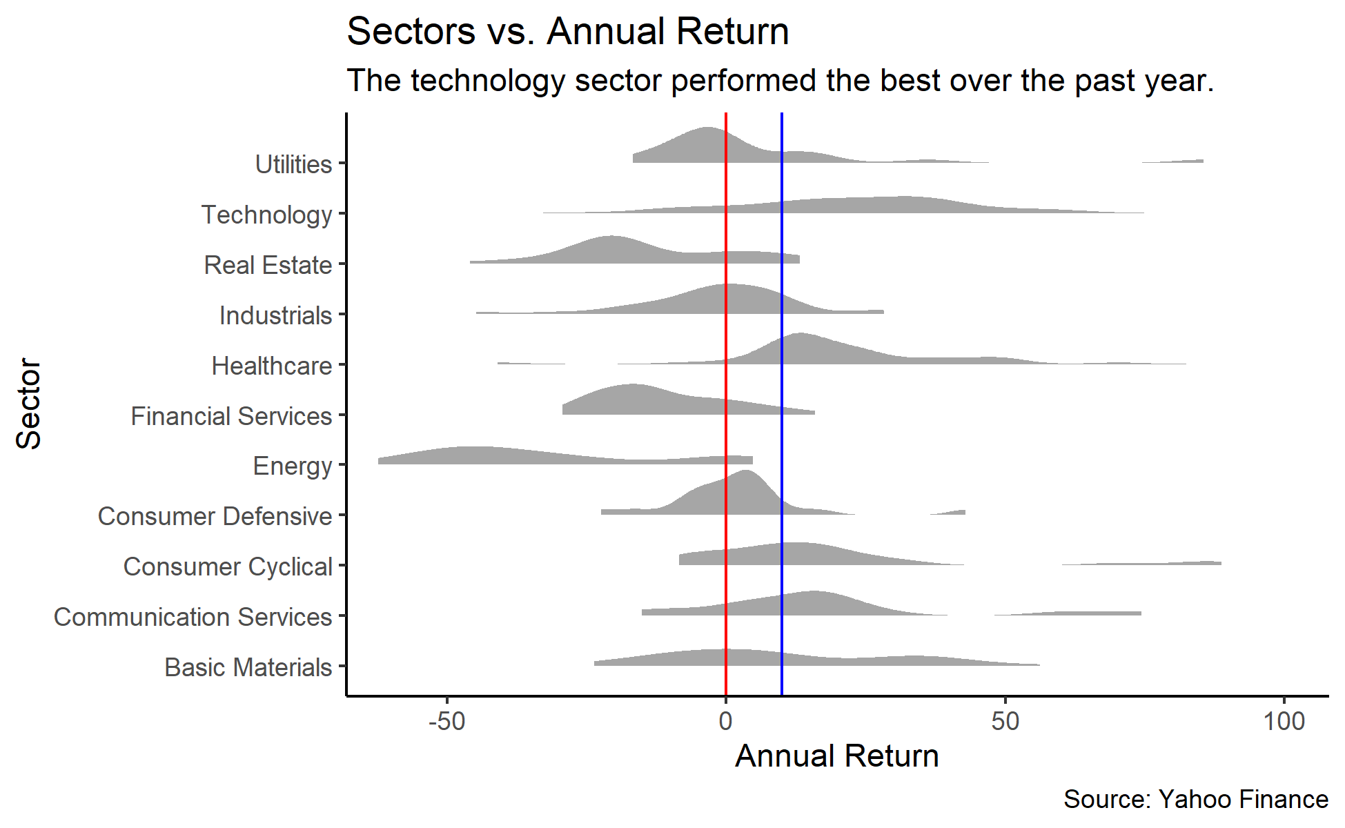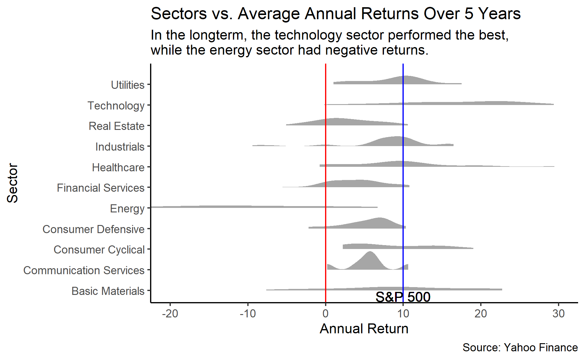 In the shorterm many sectors were less than or near 0% returns. A few (most notably, the technology sector) surpassed the benchmark of the S&P 500 (the blue line, ~10% returns), which tracks the performance of the top 500 companies.