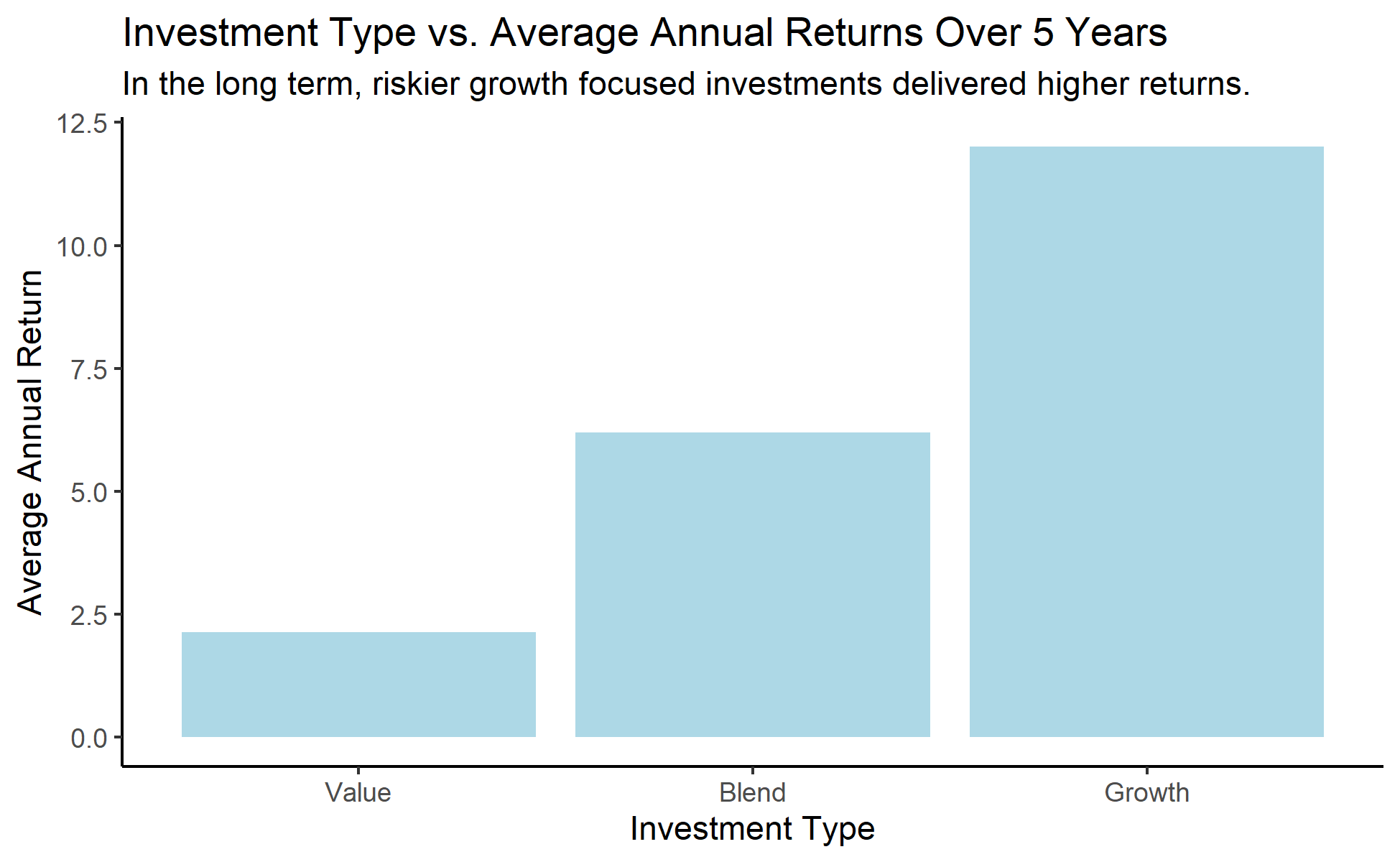 Averaging out the past 5 years, value ETFs had next to no returns allowing it to only hedge against inflation, while growth ETFs had significantly higher returns.