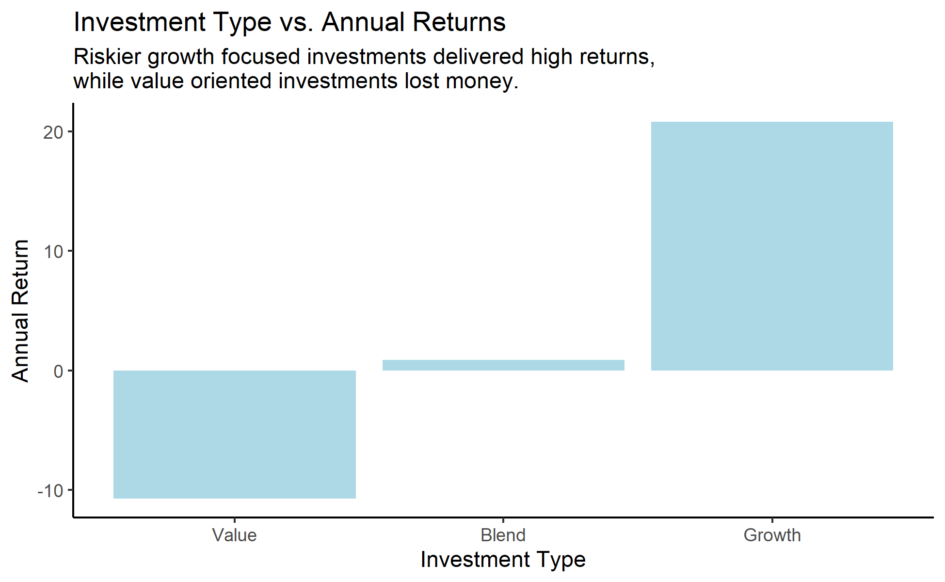 Growth focused investing focuses on investments that have the future potential to outperform the overall market. Value focused investing focuses on investments that are currently undervalued, trading below what they are really worth. During the past year, value ETFs has negative returns while growth ETFs had positive returns.