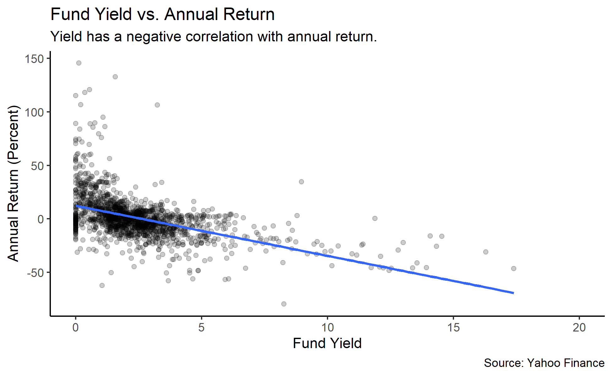 A form of investing called dividend investing has been on the rise lately, with people investing to instead maximize dividends. A fund’s yield (the income generated to investors through interest and dividends) has a negative correlation with returns. This is understandable, as often times a company the fund is invested in would offer dividends to make up for the lack of returns.
